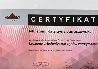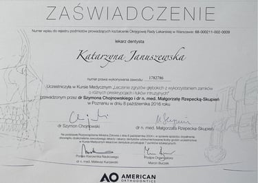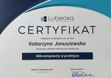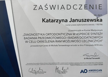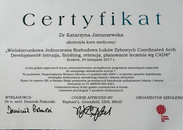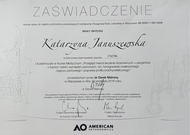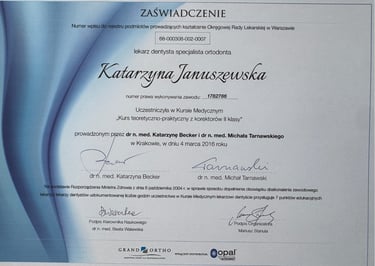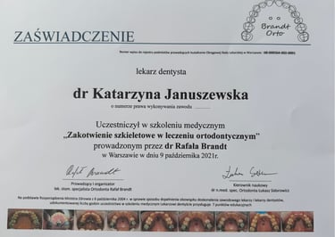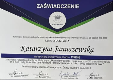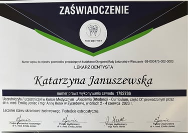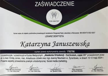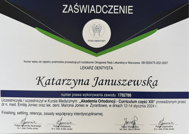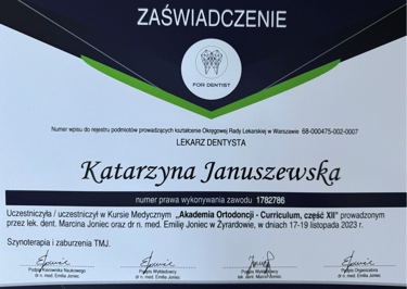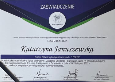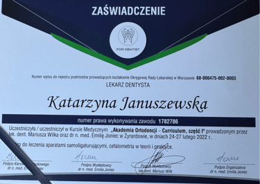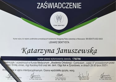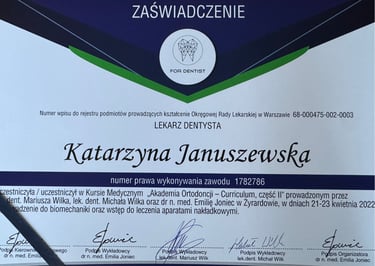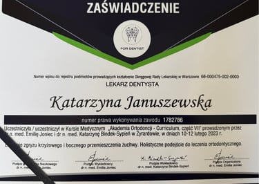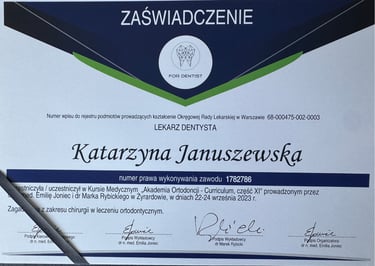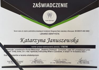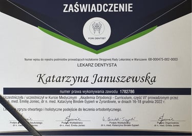 Jestem absolwentką kierunku lekarsko-dentystycznego Uniwersytetu Medycznego we Wrocławiu (2004 r.). Moja pasja do pięknego i zdrowego uśmiechu skłoniła mnie do dalszego rozwoju w dziedzinie ortodoncji. W latach 2011-2015 odbyłam specjalizację na Uniwersytecie Łódzkim, którą zakończyłam uzyskaniem tytułu specjalisty ortodonty w 2015 roku. Nieustannie podnoszę swoje kwalifikacje, uczestnicząc w licznych kursach i konferencjach w Polsce i za granicą, aby móc oferować moim pacjentom najnowocześniejsze i najskuteczniejsze metody leczenia.